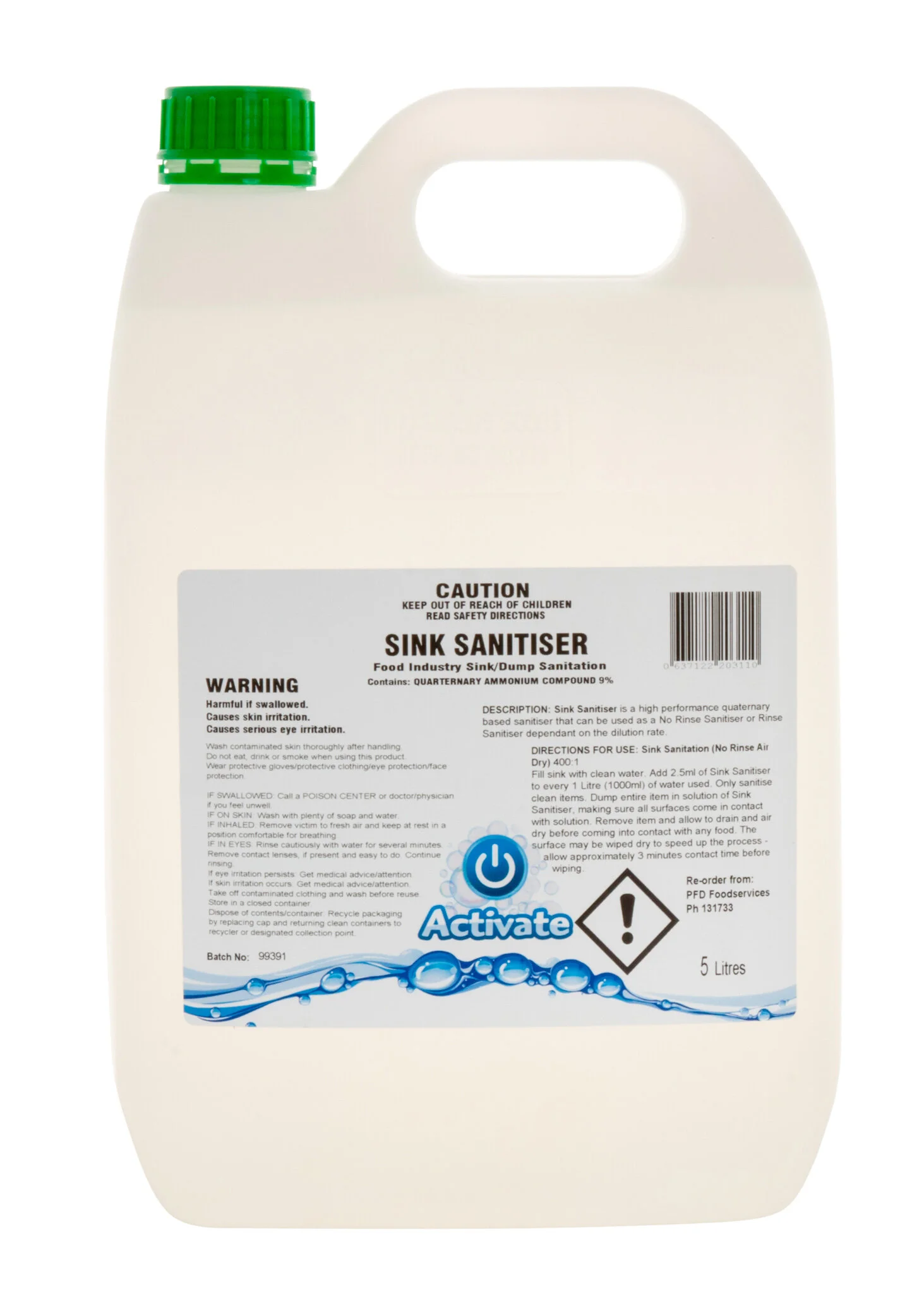 Sink Sanitiser is a high performance quaternary based sanitizer that can be used as a no rinse or rinse sanitiser dependent on the dilution rate. It can be used safely on all surfaces including metal food processing equipment & fittings.